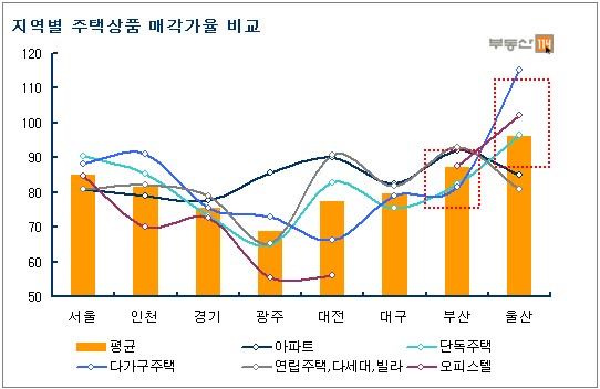 단독다가구나 연립, 오피스텔 등 비아파트 매각가율도 수도권보다 대부분 부산및 울산의 강세가 두드러졌다. 단독주택도 서울(90.5%) 경기(73.3%) 인천(85.2%) 보다 울산(96.6%)의 매각가율이 높았고 전국 최저 수준인 광주(64.8%)와 비교하면 30% 이상 높은 것으로 나타났다. 연립이나 다세대,빌라 등 일반주택도 수도권역에 비해 부산(92.8%)이 특히 높았다. 올해 부산·울산 등 경남권 아파트시장에 물건 부족사태가 지속되면서 매매가격 오름세가 지속되자 저렴한 매물을 원하는 수요가 경매시장으로 이동하면서 아파트를 포함 일반 주택 매각가율도 높아진 것으로 분석된다.