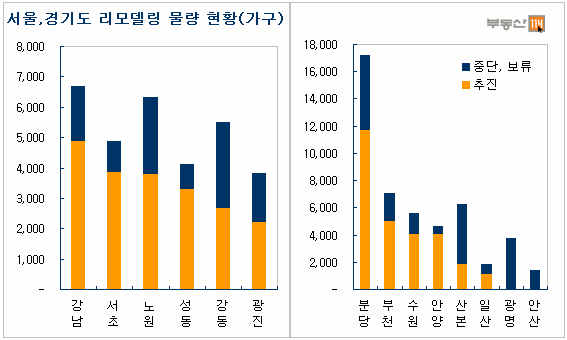 부동산114 (www.r114.co.kr)에 따르면 서울, 경기에서 리모델링을 추진했거나 추진 중인 전체 물량 중에서 사업이 실질적으로 추진되는 곳은 52% 정도이다. 48% 이상은 사업 추진이 보류되거나, 사업 자체가 무산된 상황이다. 서울은 총 5만6천75가구 중에서 2만8천944가구로 58%, 경기도는 총 4만7천839가구 중에서 2만7천806가구로 52%가 리모델링 사업 추진에 나서고 있다.